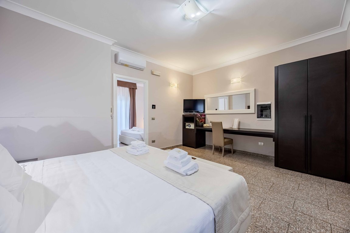 In the bathroom we find a welcoming courtesy line available to the guest, hairdryer, shower and wonderful Roman travertine coatings. In the room a well-stocked mini-bar, the warmth of the parquet, combined with the softness of the furnishing fabrics, the splendid furniture, will transmit the right comfort to those who expect the best.
